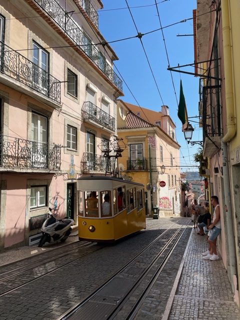 乘坐電車 (eletrico) 28E號漫遊里斯本城市是我喜歡的項目之一。28E號電車路線由東邊Martim Moniz 至西邊 Campo Ourique, 途經里斯本多個主要旅遊點, 鮮黃色的小小車箱從容的行駛在此起彼落、狹窄的路軌上,它本身就像一個大明星,到處引來遊客們的傾慕,成為拍照的主角。但是由於車箱小,載客量有限,因此要得到一個坐位,舒服地欣賞途中風光並不容易,我們在Martim Moniz 總站上車,一般人要等40至90分鐘才上到車,我問了售票員排企位,很快便上了車,而且幸運地得到坐位!