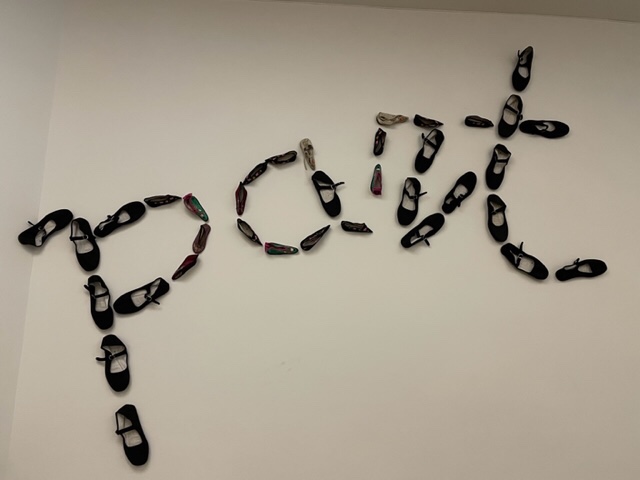 在牆上像音符樣此起彼落的一句句子,看清楚原來是用鞋子組成的,真有趣!
