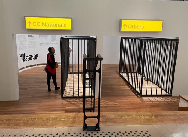 黃永砯的Passage 是否很面熟,大家歐洲入境是用EU 或是其他?關口還有兩個鐵籠,藝術家最初的構想是放一隻活生生的獅子在裏面,以表示關員的無上權力,但這當然是不可以,所以只放了附近動物園的獅子所踏過的地板。