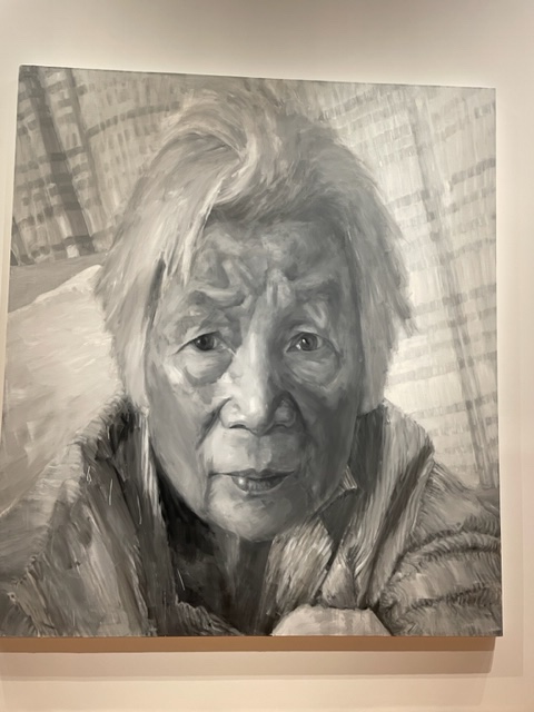 嚴佩明就有三幅展出, 她的Mona Lisa 比羅浮宮的大很多,封著Mona Lisa 掛了她母親的畫像,栩栩如生,這幅畫是他為了紀念在2018年去世的母親而畫的,畫中人栩栩如生,色調大量採用白色,這是中國喪事的代表顏色。