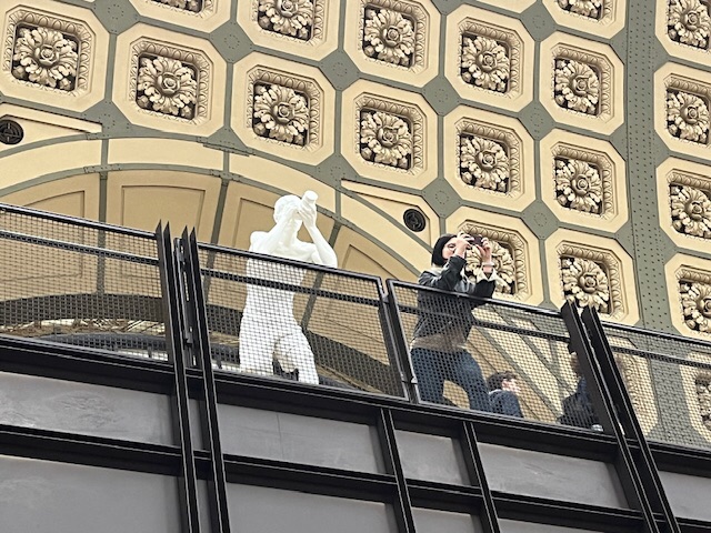 抬頭仰望,又見另一位雕塑人物低頭拍照,彷彿在記錄著身邊的觀眾。這些「人」與古典雕塑相隔時空,但又共同存在於這個空間中,讓人穿梭於現代與古典之間。