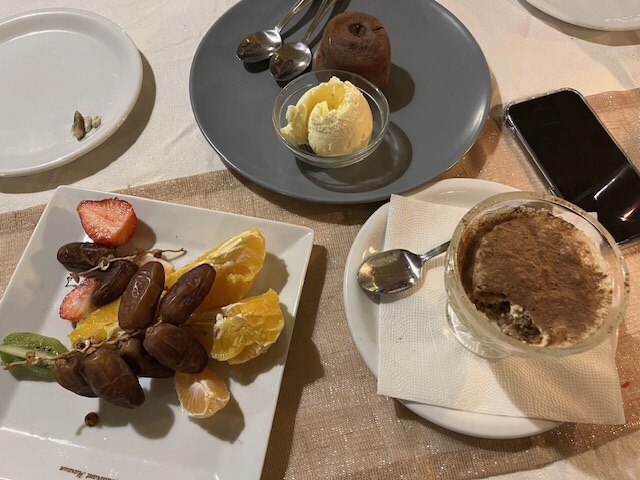 For our meal, we shared a variety of dishes, and each one was memorable. The grilled fish stood out as a favorite—perfectly cooked to keep the inside juicy while achieving a delicious crispiness on the outside. It was truly one of the best we’ve had. We also ordered the Couscous Royal, which came in a generous portion, easily enough for sharing, and it was both flavorful and satisfying. 265 dinars for 4 main courses, 3 desserts and 4 drinks.
