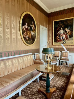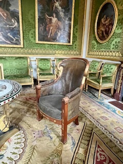 大廳 : 這裡色調採用我們稱為「帝王綠」的深綠色,是拿破崙非常常用的標準配色。房間內有一張特別設計的拿破崙專用椅子,是這個廳的亮點之一。